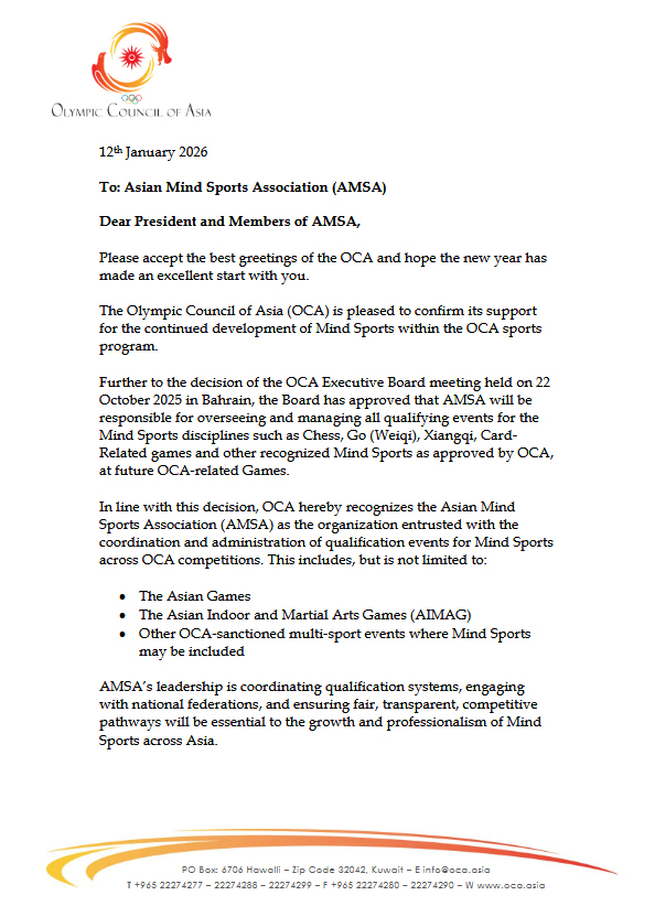 On 12 January 2026, the OCA officially confirmed its support for and recognition of the Asian Mind Sports Association (AMSA). Under this decision, AMSA is designated to coordinate and administer qualification events for Mind Sports across OCA-related multi-sport events.